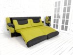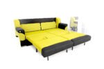 Диван-трансформер виконаний у сіро-блакитному кольорі, що надає йому сучасний та елегантний вигляд. Диван має м'яке сидіння, яке можна перетворити на рівну поверхню, створюючи зручну робочу або спальну поверхню. Подушки дивану мають вишитий дизайн, який додає естетики та комфорту. Підлокітники дивану виготовлені з дерева з глянсовим покриттям та мають ергономічний дизайн для зручності. Частина дивану витягнута, щоб показати його трансформаційну можливість; вона підтримується міцною чорною металевою рамою. Диван-трансформер "Реклайнер 5 в 1 (1900)" - це функціональний та практичний меблевий виріб, який дозволить вам насолоджуватися комфортом та функціональністю.